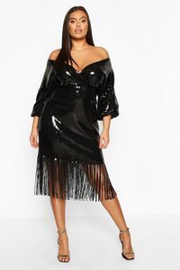 Disponible en noir, or et rouge, cette magnifique robe combine des paillettes festives et des franges. Elle est proposée dans les tailles 40 à 48.