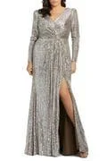 This gown is elegant and classy. “A deep neckline, soaring slit and floor-length skirt—all illuminated in tiny, opulent sequins—are arranged with finesse on an evening gown that tops the A-list.” It is available in sizes 14-24.